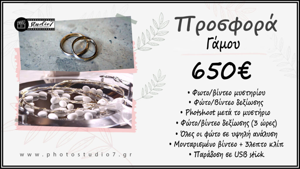 Περιλαμβάνει πλήρη κάλυψη βίντεο όλων των στιγμών, επαγγελματική βιντεοσκόπηση και καλλιτεχνική, καθώς και κάλυψη όλου του στολισμού. Παραδίδεται μονταρισμένο (1 μεγάλο κλίπ με όλο το μυστήριο και ενα μικρό με τα highlights) σε USB Stick, παρουσιασμένο σε ξύλινο κουτί μαζί με εξώφυλλο.