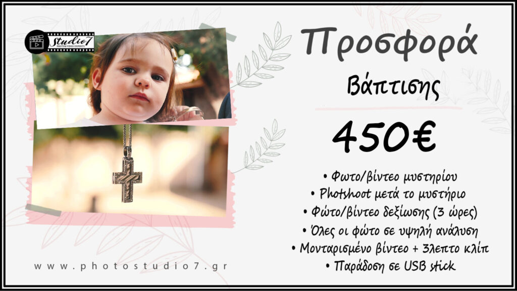 Συνήθως γίνεται πρίν την βάπτιση, στον χώρο του ζευγαριού και περιλαμβάνει φωτογράφηση του παιδιού με θεματικά props και πολύχρωμα background, δημιουργώντας μοναδικές φωτογραφίες που στολίζουν το βιβλίο ευχών, το site σας ή και την ίδια την βάπτιση αργότερα.